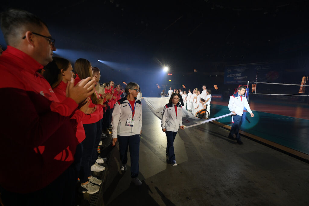 Najbardziej oczekiwanym przez kibiców momentem wieczoru był uroczysty przemarsz drużyn z całego świata. Sportowców na parkiet wprowadziły legendy piłki siatkowej – Vladimir Grbić i Sebastian Świderski. Publiczność powitała zawodników burzą oklasków, a w sektorach Spodka zasiedli przedstawiciele m.in. Austrii, Indii, Finlandii, Włoch, Iraku, Kenii, Mongolii, Namibii, Arabii Saudyjskiej, Serbii, Słowacji, Ukrainy, Zjednoczonych Emiratów Arabskich, USA – Arizona oraz gospodarzy – Polski.